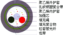 產(chǎn)品型號: GYSTY53也叫(GYTY53) 光纖松套 纜芯填充油膏 金屬中心加強PE內(nèi)護套 雙面涂塑軋紋鋼帶粘結PE外護套 | ||||